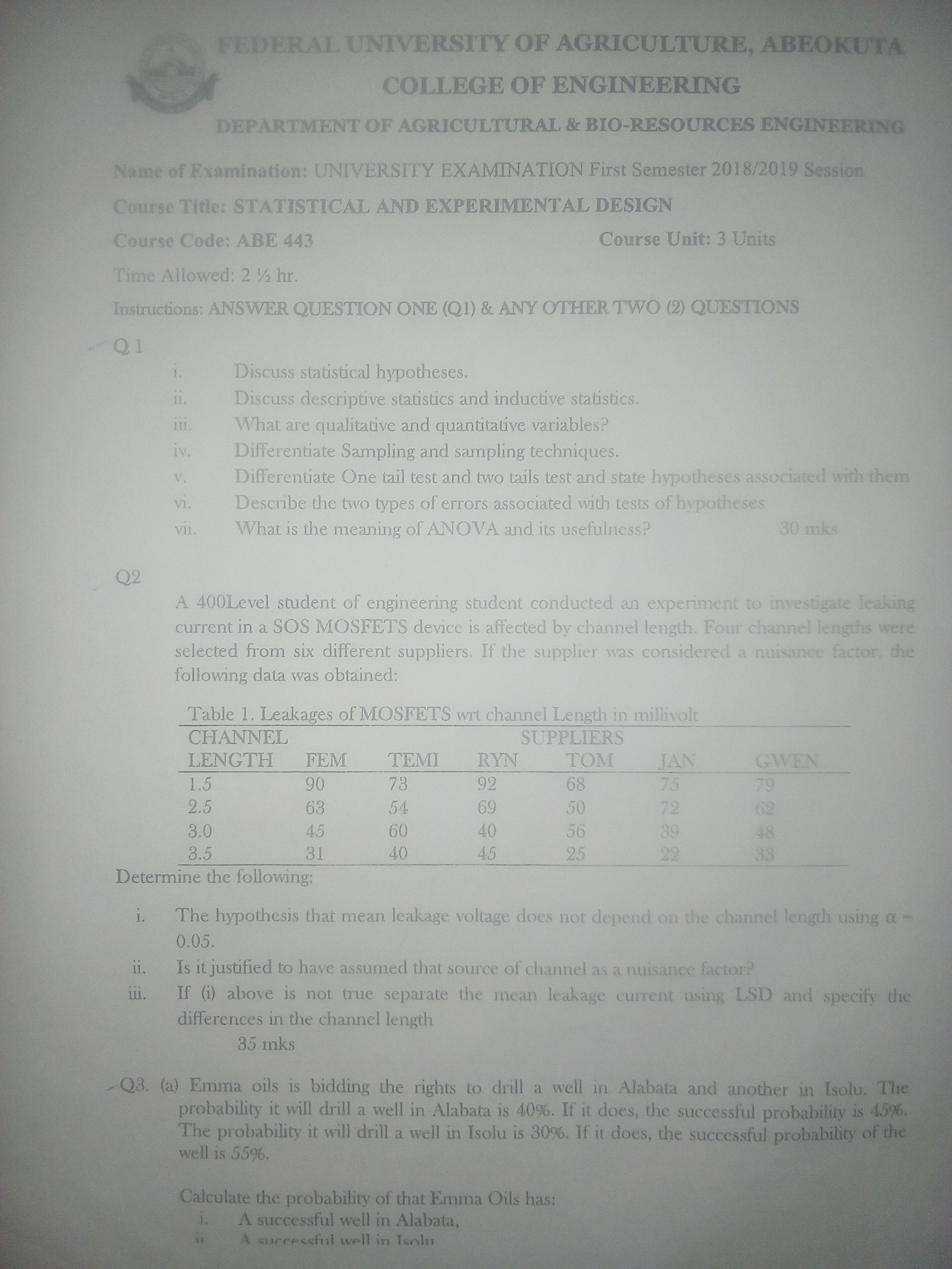 A 400Level student of engineering conducted an experiment to investigate how leaking current in a SOS MOSFETS device is affected by channel length. Four channel lengths were selected from six different suppliers. If the supplier was considered a nuisance factor, the following data was obtained.